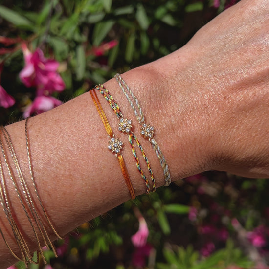 le bracelet Margotte est un bracelet féminin et discret, il se compose d’ une fleur en plaqué or 3 microns et d’oxydes de zirconium monté sur un cordon coulissant.