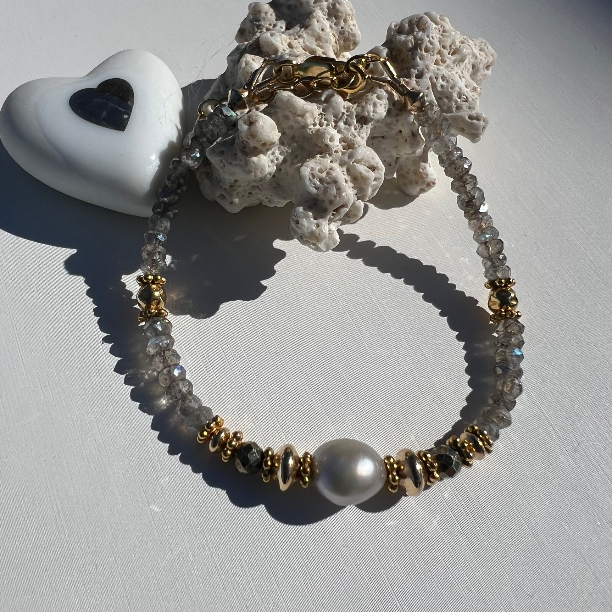 Ce bracelet à l’élégance magnétique, allie la magie protectrice des labradorirites, l’éclat minéral des pyrites et la douceur nacrée de la perle d’eau douce grise, sublimé par la lumière du plaqué or et du gold filles 14 carats .