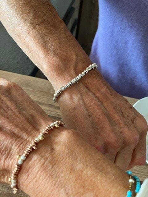 Bracelet en perles irrégulières Karen en plaqué or rose sur argent, parsemé de perles en argent 925 millièmes et en plaqué or jaune. Les perles Karen sont des perles artisanales fabriquées à la main par les tribus Karen Hill en Thaïlande, réputées pour leur savoir-faire ancestral dans la fabrication de bijoux et d'ornements, utilisant des techniques traditionnelles transmises de génération en génération. Fermoir et chaîne de rallonge en Gold Filled 14 Carats, garantissant résistance et brillance durable.