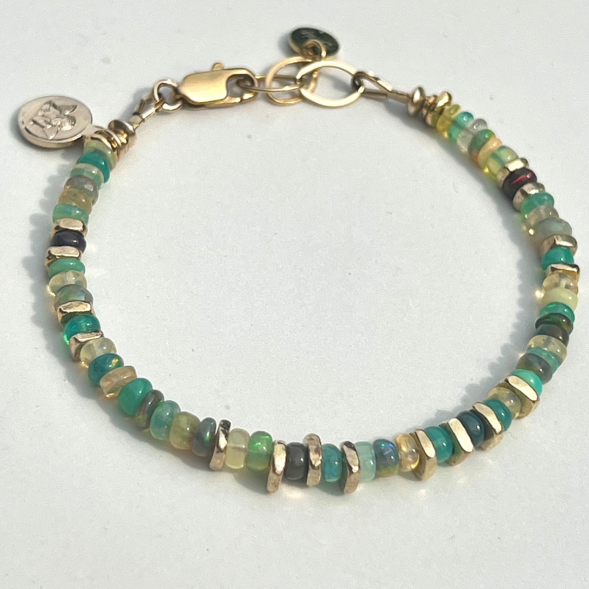 Pierres en opales multicolores dans les dégradés de vert et de jaunes. Médaille angelot en plaqué or 3 microns, autres perles en argent plaqué or 24 carats. Fermoir et chaine en gold filled laminé, assurant une parfaite résistance dans le temps.