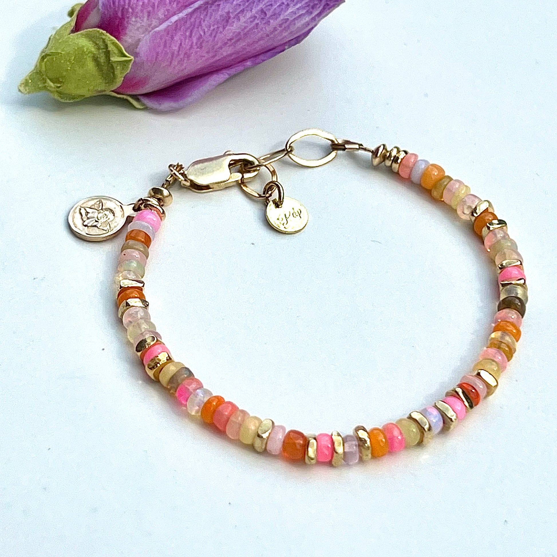 Pierres en opales multicolores dans les tons de roses, oranges, jaunes . Médaille angelot en plaqué or 3 microns, autres perles en argent plaqué or 24 carats, fermoir et chaine en gold filled laminé.