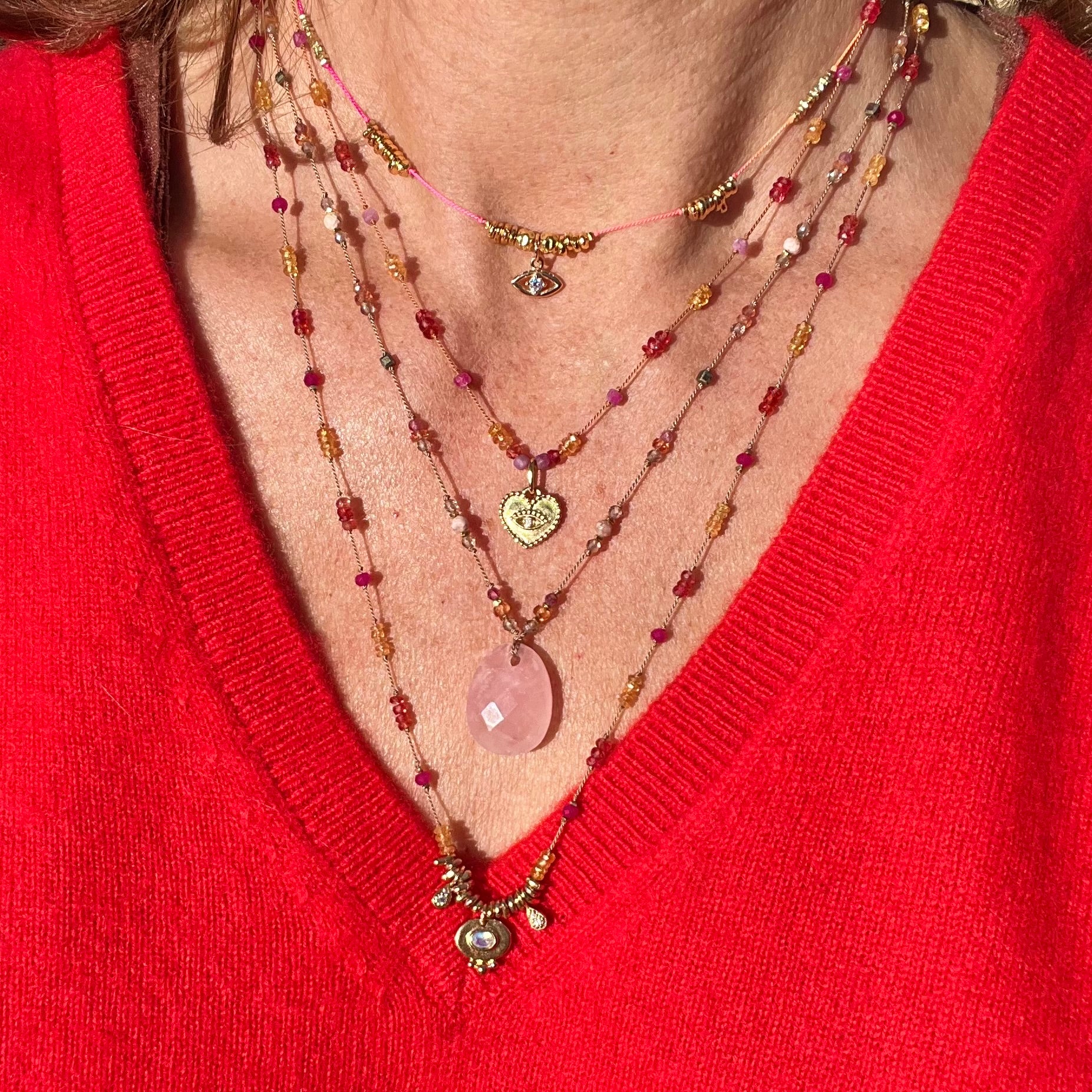 les pierres fines orchestrent l’énergie autour d’un cœur porte bonheur sublimé par l’œil protecteur d’Isis, symbole de force, d’intuition et d’harmonie.
